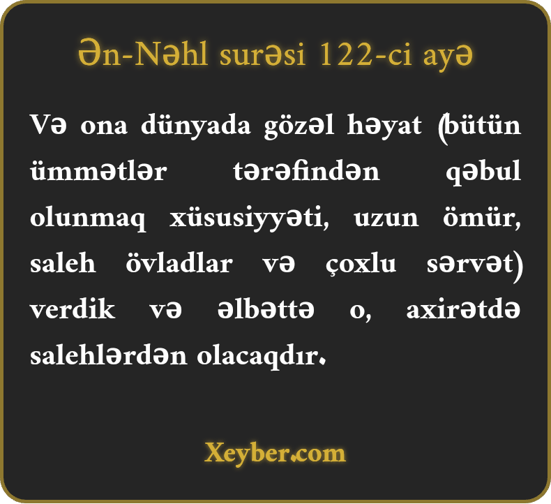 "Ona dünyada yaxşılıq verdik. Şübhəsiz, o, axirətdə də salehlərdəndir.”