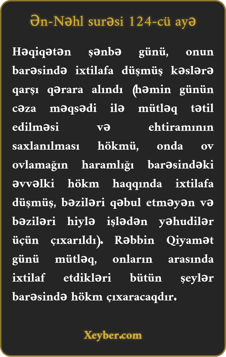 "Həqiqətən, şənbə tətili həmin məsələdə ixtilaf törədənlər üçün qərar verildi. Şübhəsiz, Rəbbin qiyamət günü onların daim ixtilafda olduqları məsələlərlə bağlı mühakimə aparacaq.”