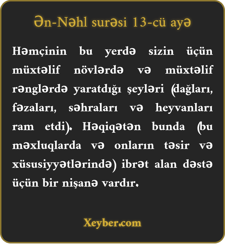 "Yer üzündəki müxtəlif əlvanlıqları da sizin üçün yaratdı. Əlbəttə, bu yaranmışlarda öyüd götürənlər üçün ibrət və aydın nişanələr var.”