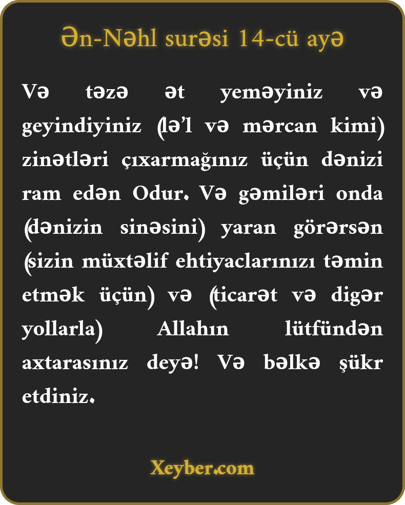 "Dənizdən təzə ət yeməyiniz, taxmaq üçün zinət şeyləri çıxarmağınız üçün onu sizə ram edən Allahdır. Dənizin sinəsini yarıb gəmilərin getdiyini görürsən. (Allah bu cür etdi ki,) Onu fəzl və lütfünü arayasınız və bəlkə, (bundan sonra) şükür edəsiniz.”