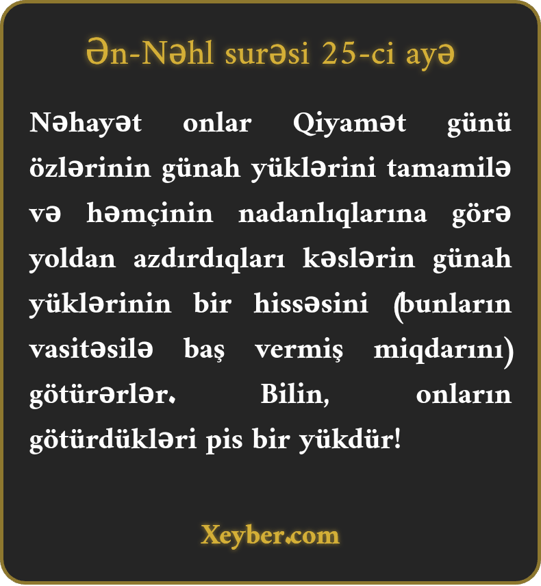 "Onlar qiyamət günü həm öz günah yüklərini bütünlüklə, həm də bilmədən yoldan çıxardıqlarının günah yükünün bir hissəsini çiyinlərinə almalıdırlar. Bilin ki, necə də pis bir yük götürürlər.”