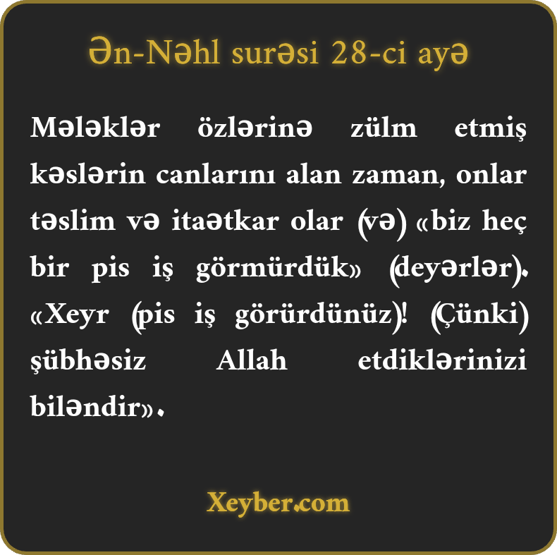 "Mələklər özlərinə sitəm qılanların canlarını aldıqda onlar itaətlə baş əyər (aldadaraq deyərlər:) "Biz heç bir pis iş görməmişik.” Elə deyil! Şübhəsiz, Allah gördüyünüz işlərdən agahdır.”