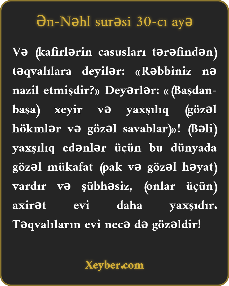 "Müttəqilərə deyilir: "Rəbbiniz nə nazil edib?” Deyərlər: "Xeyir (nazil etmişdir).” Yaxşılıq edənlər üçün dünyada yaxşılıq var. Şübhəsiz, axirət evi daha üstündür. Pəhrizkarların yeri necə də yaxşıdır!”
