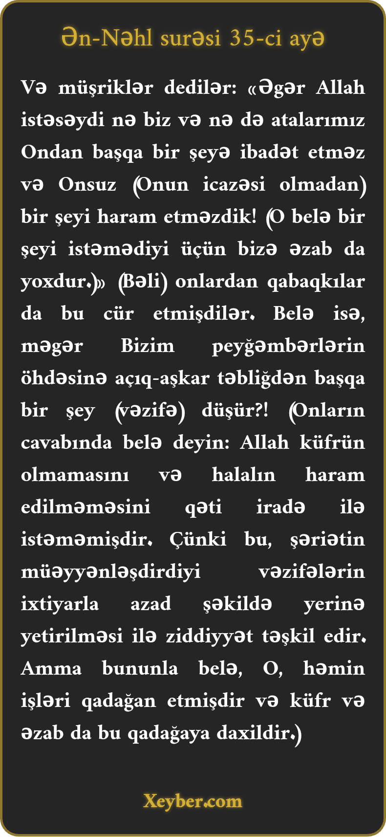 "Müşriklər dedilər: "Əgər Allah istəsəydi nə biz, nə də bizim atalarımız Ondan qeyrisinə pərəstiş etməz, Onun hökmü olmadan heç nəyi haram saymazdıq.” Onlardan əvvəlkilər də belə rəftar edirdilər. Məgər peyğəmbərlərin aşkar bəyandan savay nə vəzifəsi var?!”