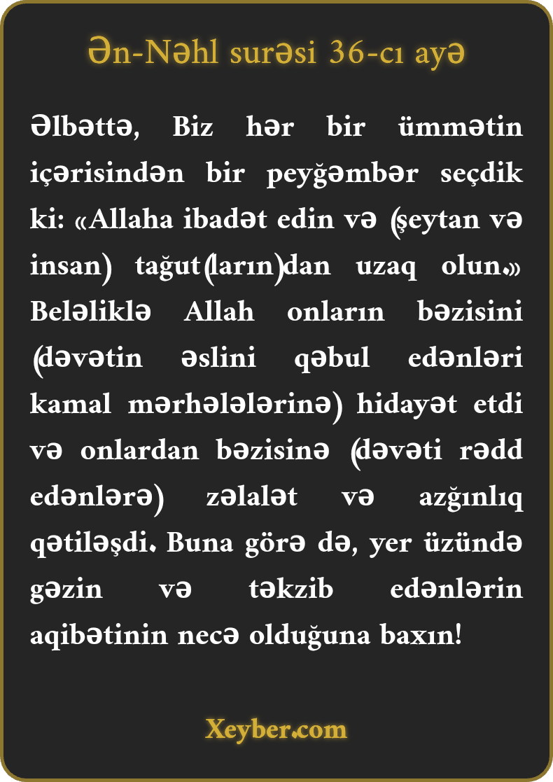 "Həqiqətən, Biz hər ümmət arasında bir peyğəmbər seçdik ki, (xalqa desin:) «Allaha pərəstiş edin və zalım hakimlərdən, Tağutdan uzaq olun.» Xalqın bir dəstəsi Allah tərəfindən hidayət olunanlardır. Bəziləri isə azğınlığa layiqdir. Yer üzündə səfərə çıxın ki, təkzib edənlərin işinin aqibətini görəsiniz.”