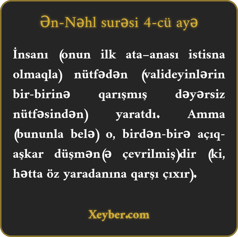 "O, insanı nütfədən yaratdı. O isə aşkar şəkildə (Allahla) düşmənçilik edir.”