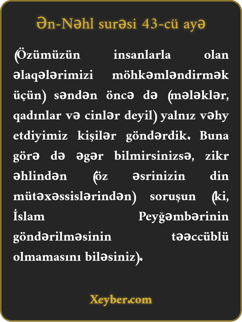"Biz səndən öncə də yalnız vəhy etdiyimiz (mələk və ya digər mövcud yox) kişilər göndərdik. (Onlar sənin gəlişinə təəccüb edirlər. Onlara de ki,) əgər (öyrənə) bilmirsinizsə, zikr əhlindən soruşun.”