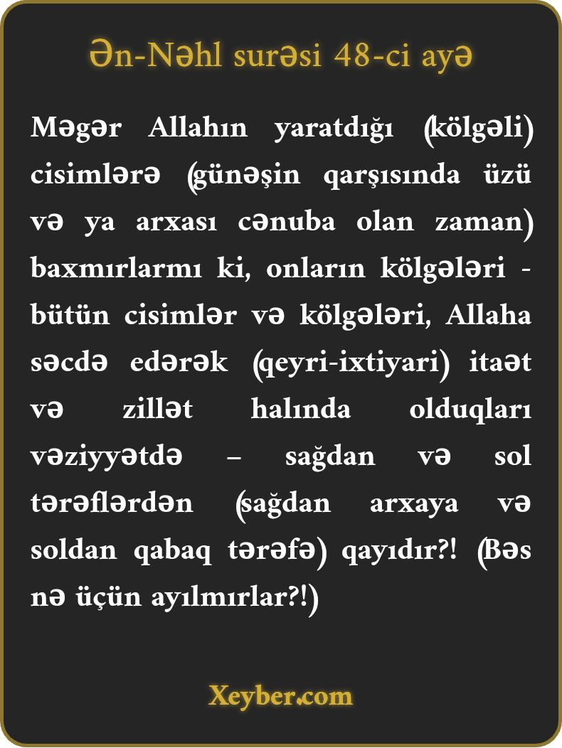 "Allahın yaratdığı şeylərin sağdan və soldan kölgələrinin səcdə edən halda döşəndiyini görmürlərmi?!”