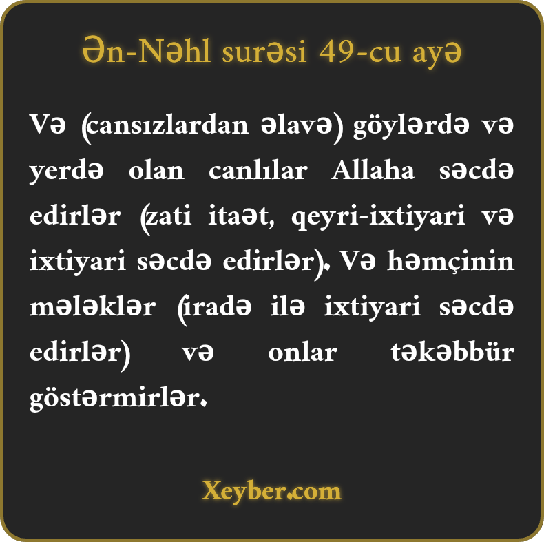"Göylərdə və yerdə olan canlılar, həm də mələklər yalnız Allaha səcdə edər və təkəbbür göstərməzlər.”