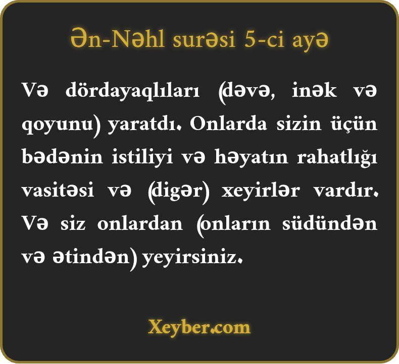 "O, dördayaqlıları yaratdı. Onlar sizin üçün istilik və bəhrələnmə vasitəsidir, onlardan (ətindən və südündən) yeyirsiniz.”