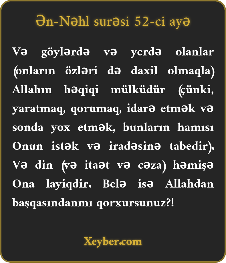 "Göylərdə və yerlərdə olan Onundur. Pərəstiş və itaət daim Onun üçündür. Yoxsa Allahdan qeyrisindənmi qorxursunuz?”
