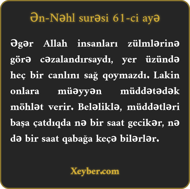 "Əgər Allah insanları etdikləri zülmə görə cəzalandırsaydı, yer üzündə heç bir canlı qalmazdı. Amma onların cəzasını müəyyən vaxtadək təxirə salar. Elə ki, əcəlləri çatdı, onu bir saat sonraya ata bilməz, bir saat irəli çəkə bilməzlər.”