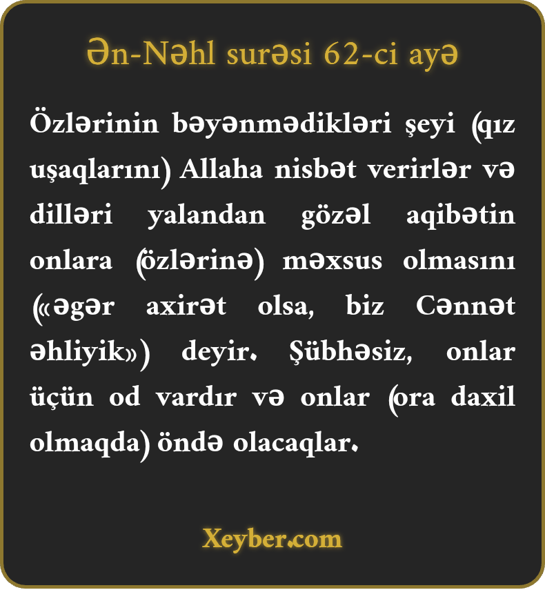 "Müşriklər özləri üçün bəyənmədiklərini Allaha aid edirlər. Yalan olaraq deyirlər ki, ən gözəl olanlar onlar üçündür. Həqiqətən, onlar üçün olan oddur və onlar (oda doğru) öncüldürlər.”