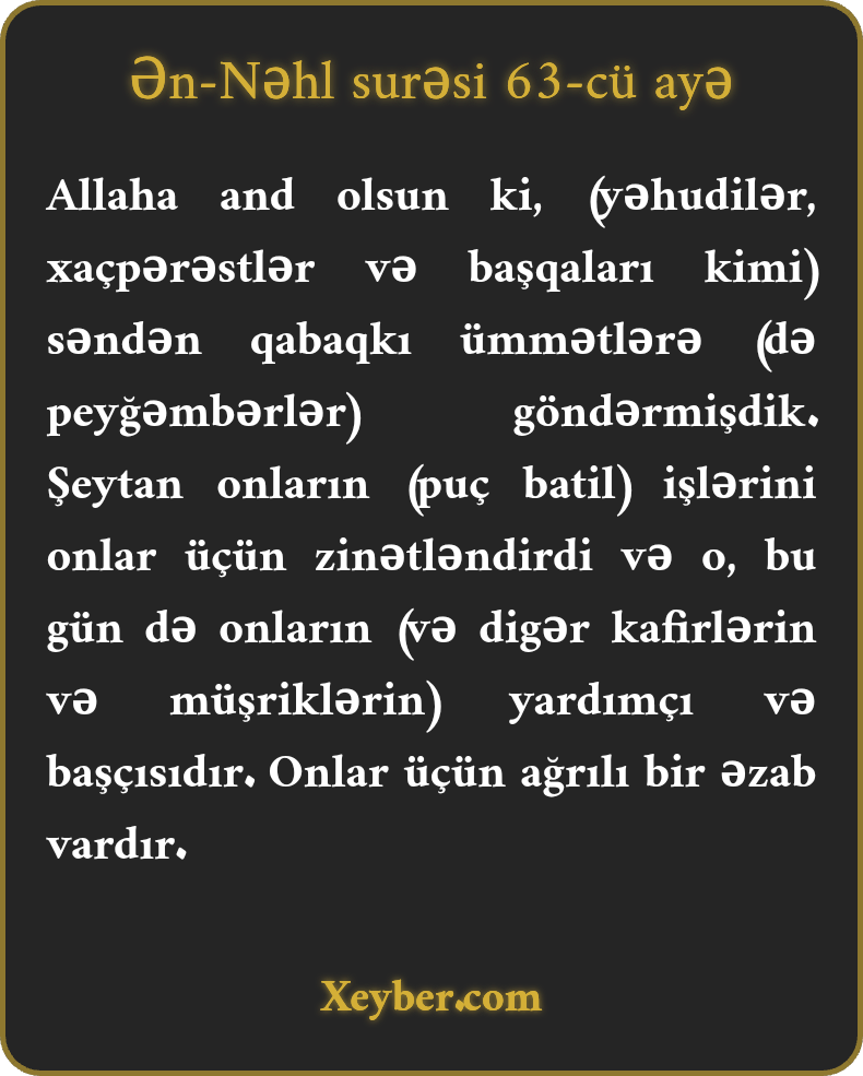 "And olsun Allaha, həqiqətən, Biz səndən qabaq da ümmətlərə peyğəmbərlər göndərdik. Şeytan onların (müşriklərin) əməllərini onlara gözəl göstərdi. (Şeytan) bu gün də onların hamisidir. Onlar üçün dərdli əzab var.”