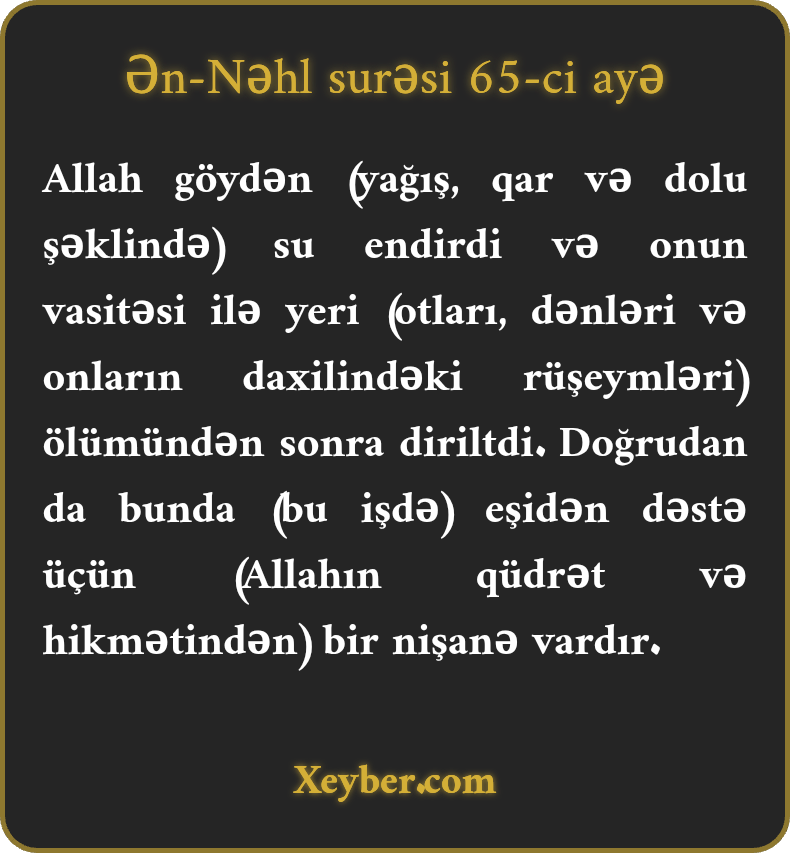"Allah səmadan su nazil etdi, onun vasitəsi ilə ölmüş torpağı diriltdi. Əlbəttə bunda eşidənlər üçün aydın nişanələr var.”