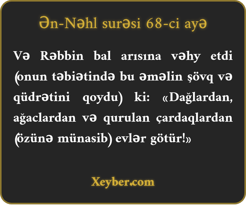 "Rəbbin bal arısına vəhy etdi ki, bəzi dağlarda, ağaclarda və insanların tikdiyi örtülü yerlərdə yuva qur.”