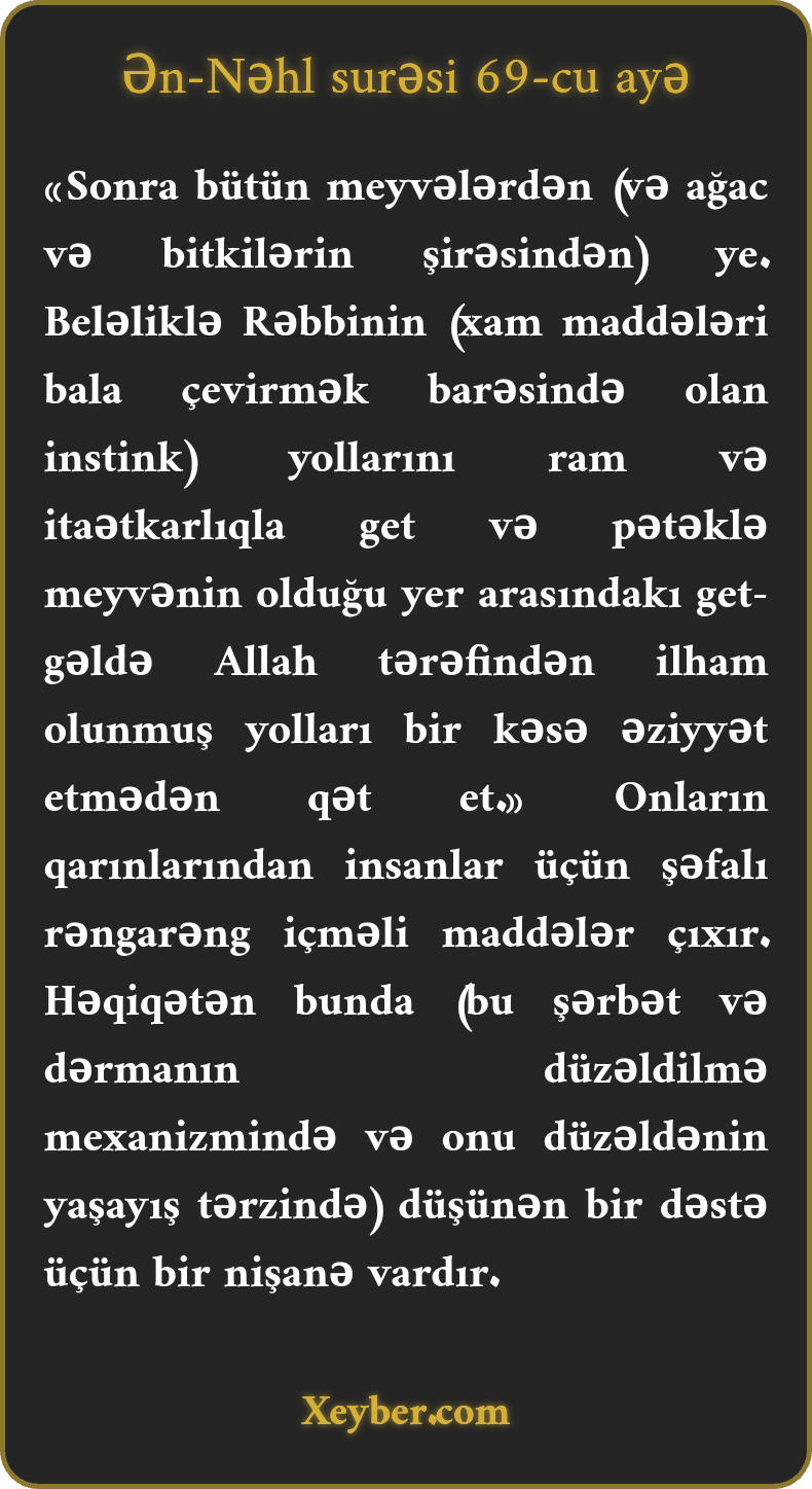 "Sonra bütün meyvələrdən ye, Rəbbinin yolunu mütiliklə adla. Onların (arıların) qarınlarından insanlar üçün şəfa olan rəngarəng maye çıxır. Əlbəttə, bunda (bal arısının həyatında) düşünən insanlar üçün ibrət var.”