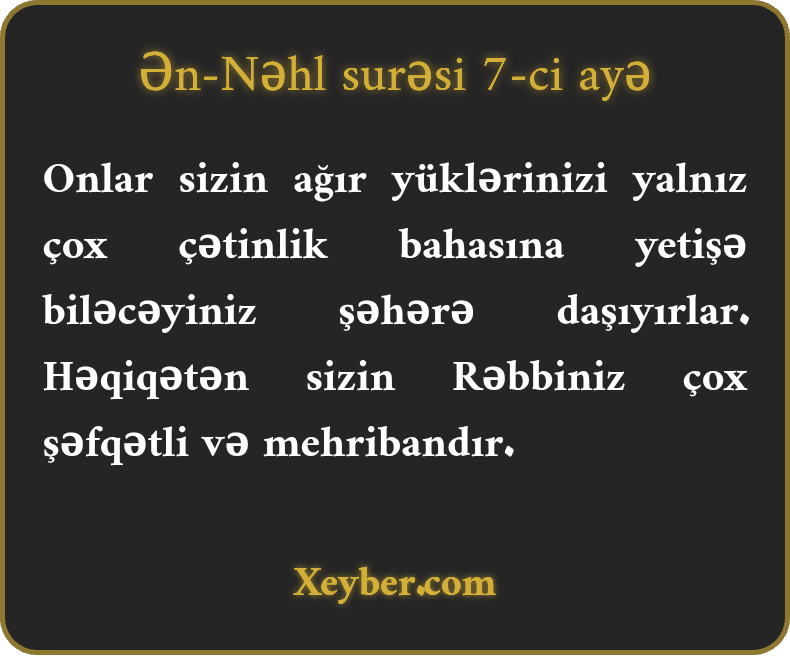 "Onlar sizin yüklərinizi ağır əziyyətsiz çatdıra bilməyəcəyiniz şəhərə daşıyırlar. Həqiqətən, sizin Rəbbiniz rəuf (rəfətli) və mehribandır.”