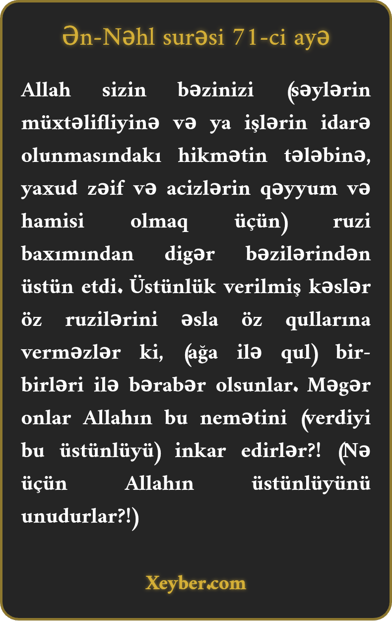 "Allah ruzi baxımından sizlərdən bəzisini digərlərindən üstün etmişdir. Üstün edilənlər öz ruzilərini tabeçiliklərində olanlara verməzlər ki, hamı bərabər olsun. Yoxsa Allahın nemətini inkar edirsiniz?”
