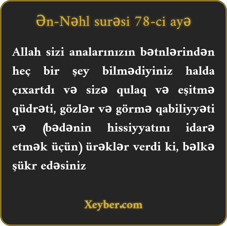 "Heç bir şey bilmədiyiniz halda Allah sizi analarınızın bətnindən çıxardı. Sizə qulaq, göz, qəlb verdi ki, bəlkə şükür edəsiniz.”