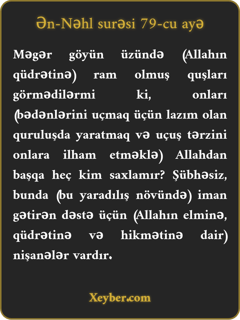 "Səmada ram edilmiş (saxlanılmış halda qalan) quşları görmürlərmi? Onları yalnız Allah saxlayır. Əlbəttə, bunda (bu uçuşda) iman gətirənlər üçün aydın nişanələr var.”