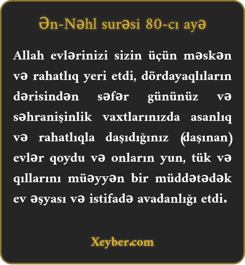 "Allah evlərinizi sizin üçün aramlıq səbəbi qərar verdi. Dördayaqlıların dərilərindən köç günü və dayanış günü sizin üçün yüngül və lətif xeymələr (çadırlar) düzəltdi. Onların yunundan, kürkündən və tüklərindən müəyyən müddət üçün əşyalar və həyat vasitələri hazırladı.”