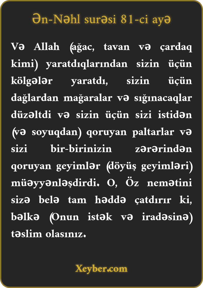 "Allah yaratdıqlarından sizin üçün kölgəliklər qərar verdi ("xəlq etdi”). Dağlarda sizin üçün mağaralar hazırladı ("yaratdı”), sizi istidən (və soyuqdan) qoruyan libaslar, bir-birinizin zərbələrindən qoruyan zirehlər düzəltdi ("yaratdı”). Beləcə, (Allah) sizə Öz nemətini tamamladı. Ola bilsin ki, özünüzü Ona təslim edəsiniz.”