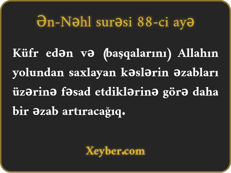 "Kafir olub xalqı Allahın yolundan çəkindirənlərin davamlı fəsadlarına cəza olaraq əzablarına əzab artırarıq.”