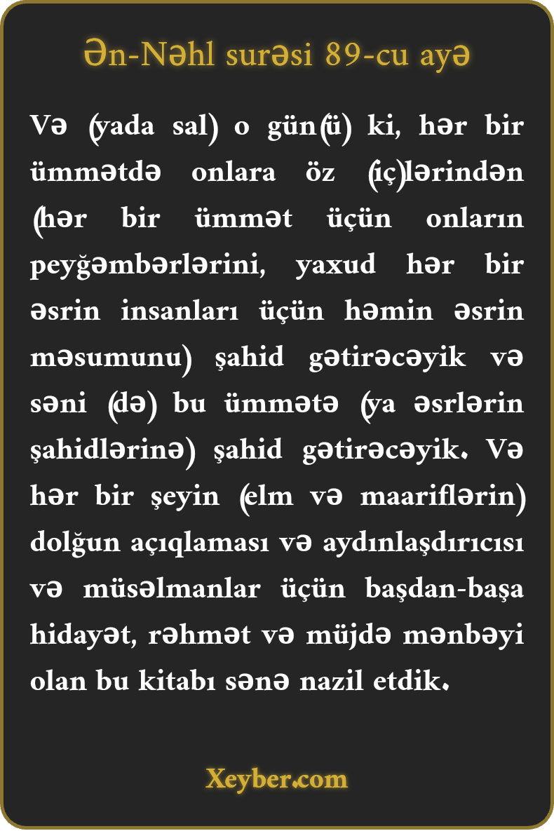 "(Xatırla) o gün ki, hər ümmət arasında onlara özlərindən olan şahid gətirərik və səni də onlara şahid tutarıq. Sənə hər şeyi aydınladan, müsəlmanlar üçün hidayət, rəhmət və müjdə səbəbi olan bu Kitabı nazil etdik.”