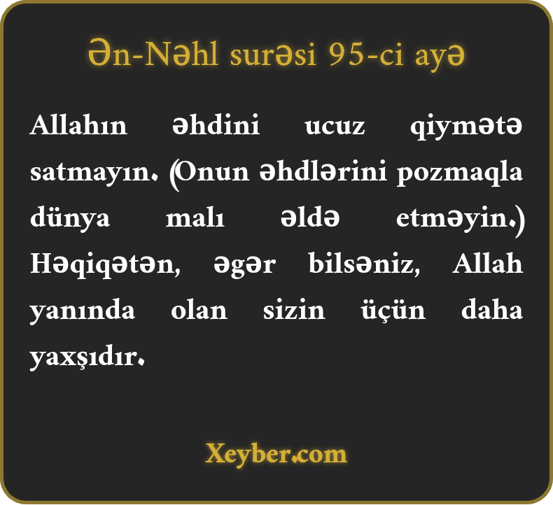 "Allahla əhdinizi ucuz qiymətə müamilə etməyin. Çünki Allahın yanında olan sizin üçün daha üstündür. Əgər bilsəydiniz!”