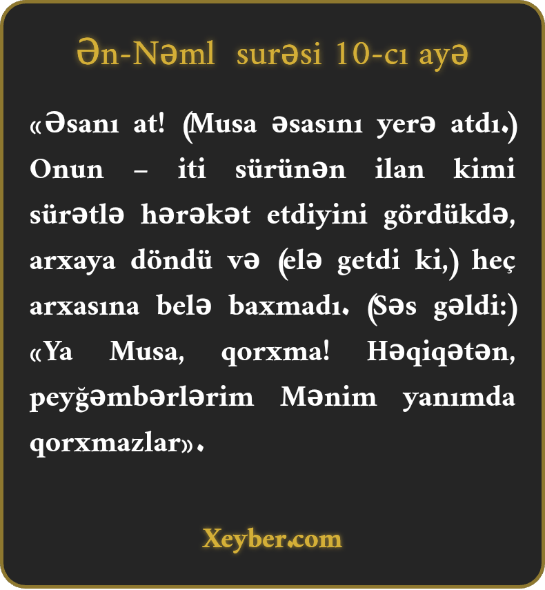 «Əsanı at! (Musa əsasını yerə atdı.) Onun – iti sürünən ilan kimi sürətlə hərəkət etdiyini gördükdə, arxaya döndü və (elə getdi ki,) heç arxasına belə baxmadı. (Səs gəldi:) «Ya Musa, qorxma! Həqiqətən, peyğəmbərlərim Mənim yanımda qorxmazlar».