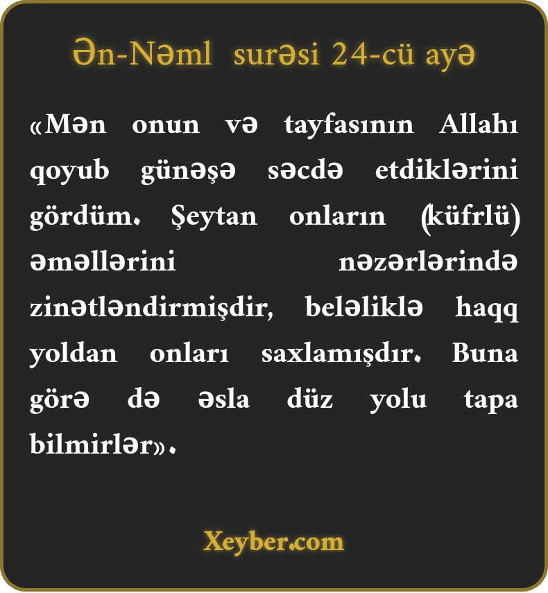 «Mən onun və tayfasının Allahı qoyub günəşə səcdə etdiklərini gördüm. Şeytan onların (küfrlü) əməllərini nəzərlərində zinətləndirmişdir, beləliklə haqq yoldan onları saxlamışdır. Buna görə də əsla düz yolu tapa bilmirlər».