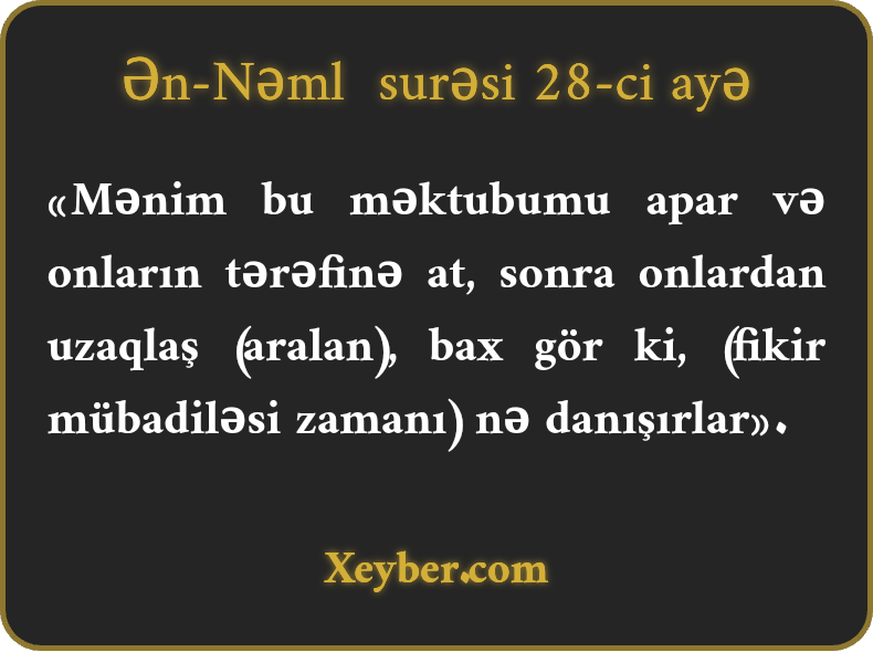 «Mənim bu məktubumu apar və onların tərəfinə at, sonra onlardan uzaqlaş (aralan), bax gör ki, (fikir mübadiləsi zamanı) nə danışırlar».