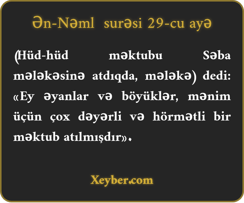 (Hüd-hüd məktubu Səba mələkəsinə atdıqda, mələkə) dedi: «Ey əyanlar və böyüklər, mənim üçün çox dəyərli və hörmətli bir məktub atılmışdır».