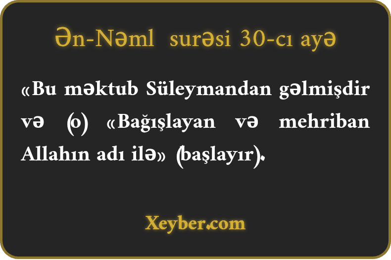 «Bu məktub Süleymandan gəlmişdir və (o) «Bağışlayan və mehriban Allahın adı ilə» (başlayır).
