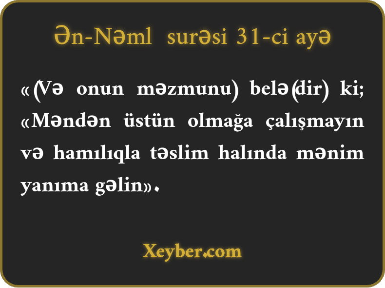 «(Və onun məzmunu) belə(dir) ki; «Məndən üstün olmağa çalışmayın və hamılıqla təslim halında mənim yanıma gəlin».