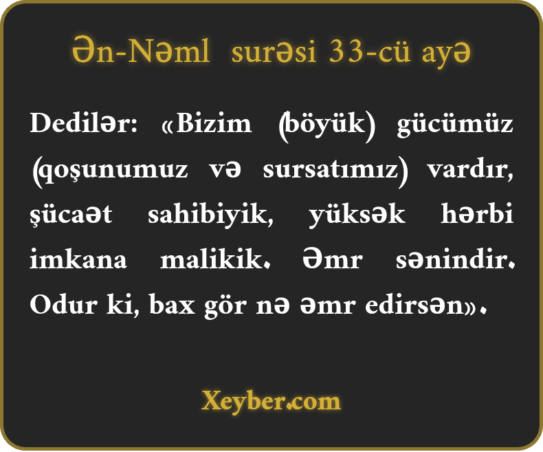 Dedilər: «Bizim (böyük) gücümüz (qoşunumuz və sursatımız) vardır, şücaət sahibiyik, yüksək hərbi imkana malikik. Əmr sənindir. Odur ki, bax gör nə əmr edirsən».