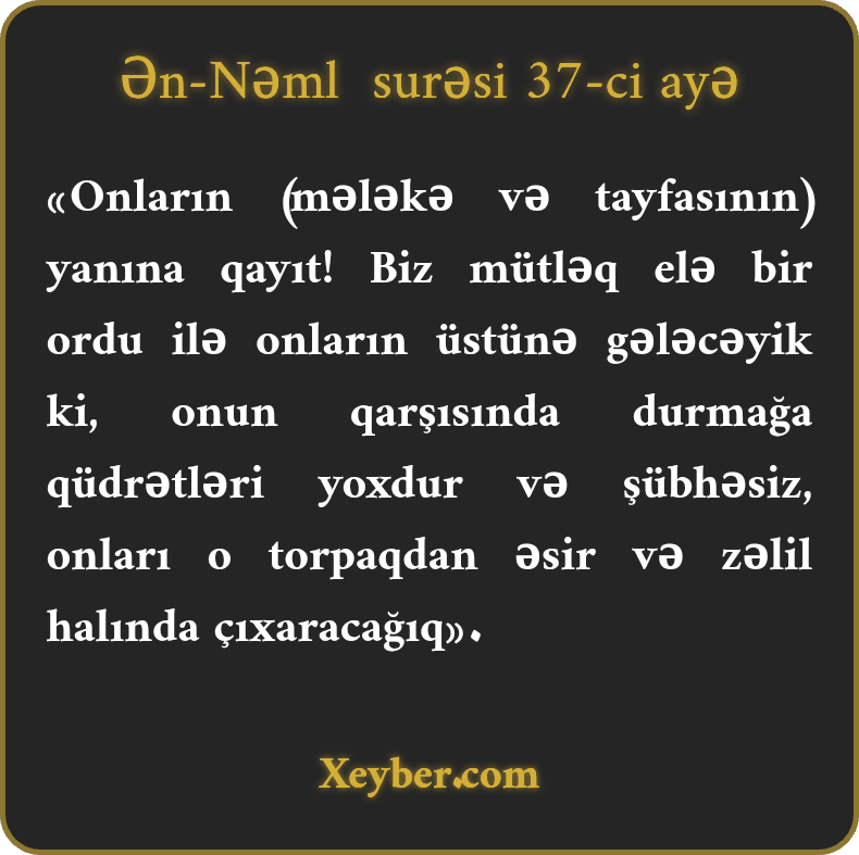 «Onların (mələkə və tayfasının) yanına qayıt! Biz mütləq elə bir ordu ilə onların üstünə gələcəyik ki, onun qarşısında durmağa qüdrətləri yoxdur və şübhəsiz, onları o torpaqdan əsir və zəlil halında çıxaracağıq».
