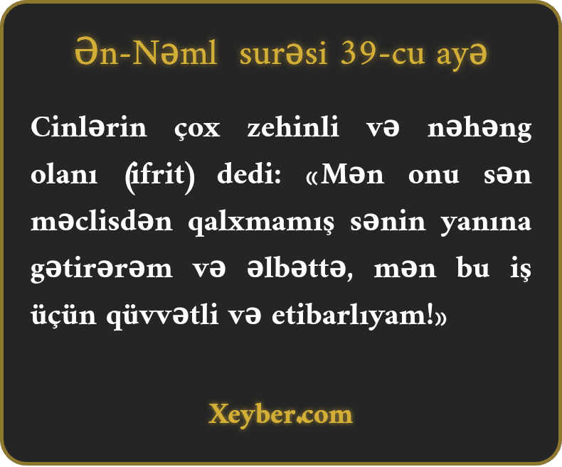Cinlərin çox zehinli və nəhəng olanı (ifrit) dedi: «Mən onu sən məclisdən qalxmamış sənin yanına gətirərəm və əlbəttə, mən bu iş üçün qüvvətli və etibarlıyam!»