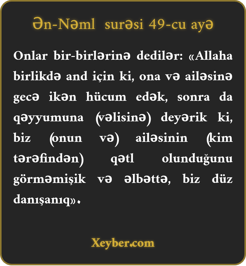 Onlar bir-birlərinə dedilər: «Allaha birlikdə and için ki, ona və ailəsinə gecə ikən hücum edək, sonra da qəyyumuna (vəlisinə) deyərik ki, biz (onun və) ailəsinin (kim tərəfindən) qətl olunduğunu görməmişik və əlbəttə, biz düz danışanıq».