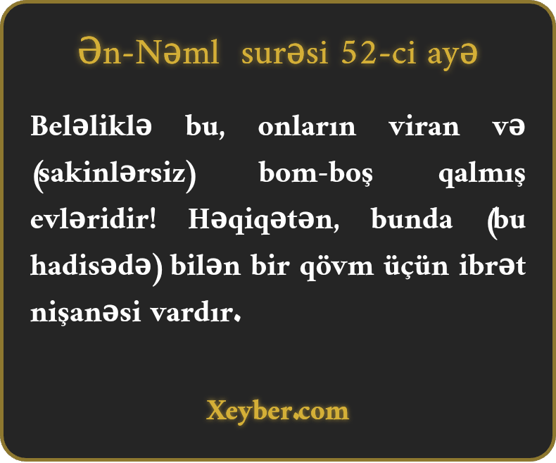 Beləliklə bu, onların viran və (sakinlərsiz) bom-boş qalmış evləridir! Həqiqətən, bunda (bu hadisədə) bilən bir qövm üçün ibrət nişanəsi vardır.