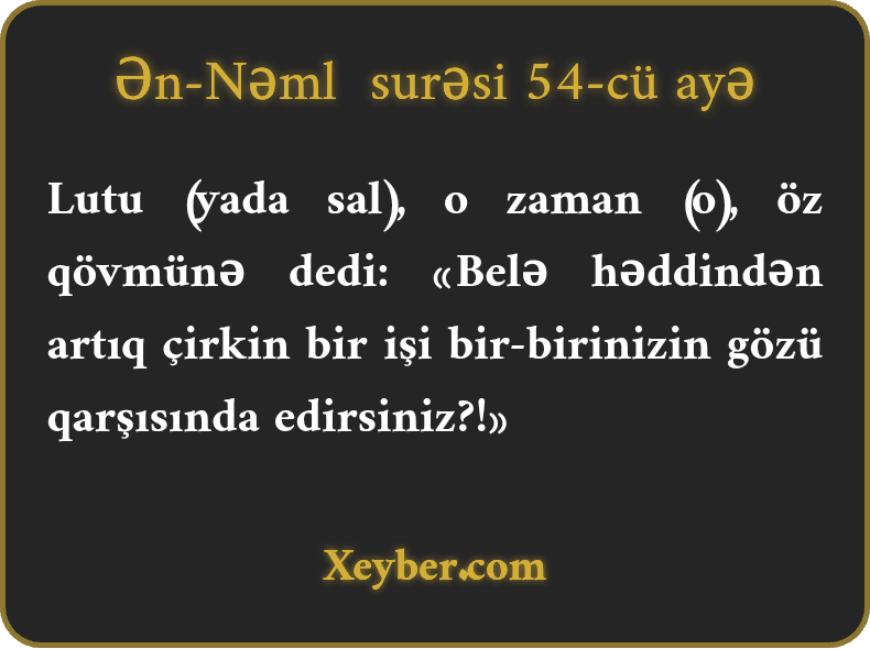 Lutu (yada sal), o zaman (o), öz qövmünə dedi: «Belə həddindən artıq çirkin bir işi bir-birinizin gözü qarşısında edirsiniz?!»