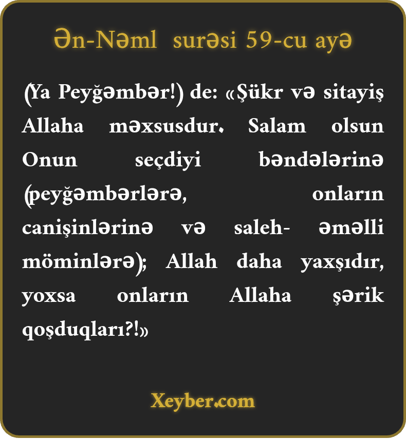(Ya Peyğəmbər!) de: «Şükr və sitayiş Allaha məxsusdur. Salam olsun Onun seçdiyi bəndələrinə (peyğəmbərlərə, onların canişinlərinə və saleh- əməlli möminlərə); Allah daha yaxşıdır, yoxsa onların Allaha şərik qoşduqları?!»