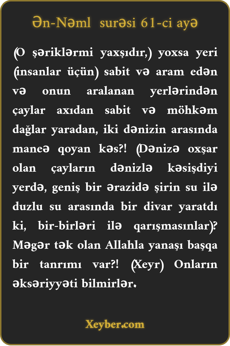 (O şəriklərmi yaxşıdır,) yoxsa yeri (insanlar üçün) sabit və aram edən və onun aralanan yerlərindən çaylar axıdan sabit və möhkəm dağlar yaradan, iki dənizin arasında maneə qoyan kəs?! (Dənizə oxşar olan çayların dənizlə kəsişdiyi yerdə, geniş bir ərazidə şirin su ilə duzlu su arasında bir divar yaratdı ki, bir-birləri ilə qarışmasınlar)? Məgər tək olan Allahla yanaşı başqa bir tanrımı var?! (Xeyr) Onların əksəriyyəti bilmirlər.