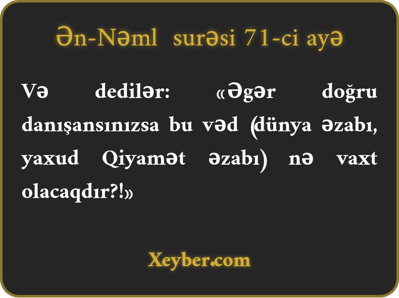Və dedilər: «Əgər doğru danışansınızsa bu vəd (dünya əzabı, yaxud Qiyamət əzabı) nə vaxt olacaqdır?!»