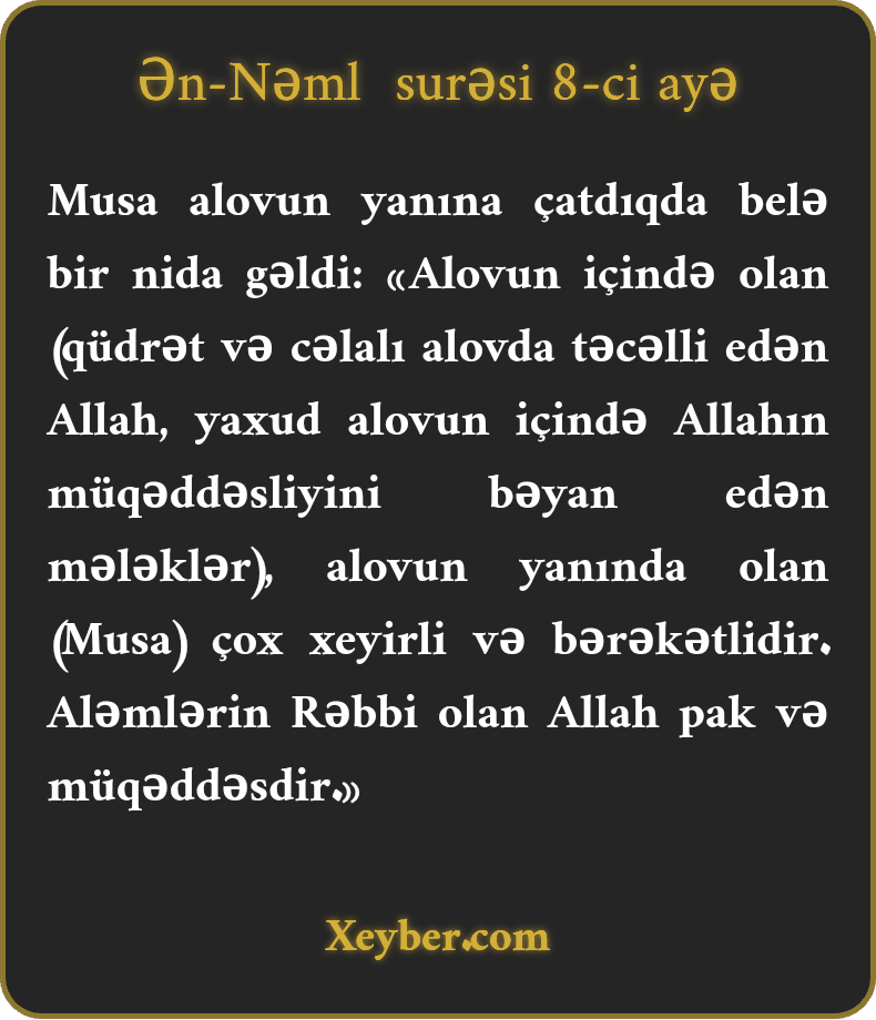 Musa alovun yanına çatdıqda belə bir nida gəldi: «Alovun içində olan (qüdrət və cəlalı alovda təcəlli edən Allah, yaxud alovun içində Allahın müqəddəsliyini bəyan edən mələklər), alovun yanında olan (Musa) çox xeyirli və bərəkətlidir. Aləmlərin Rəbbi olan Allah pak və müqəddəsdir.»