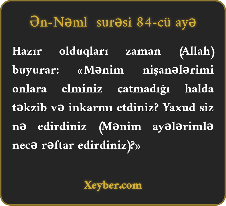 Hazır olduqları zaman (Allah) buyurar: «Mənim nişanələrimi onlara elminiz çatmadığı halda təkzib və inkarmı etdiniz? Yaxud siz nə edirdiniz (Mənim ayələrimlə necə rəftar edirdiniz)?»