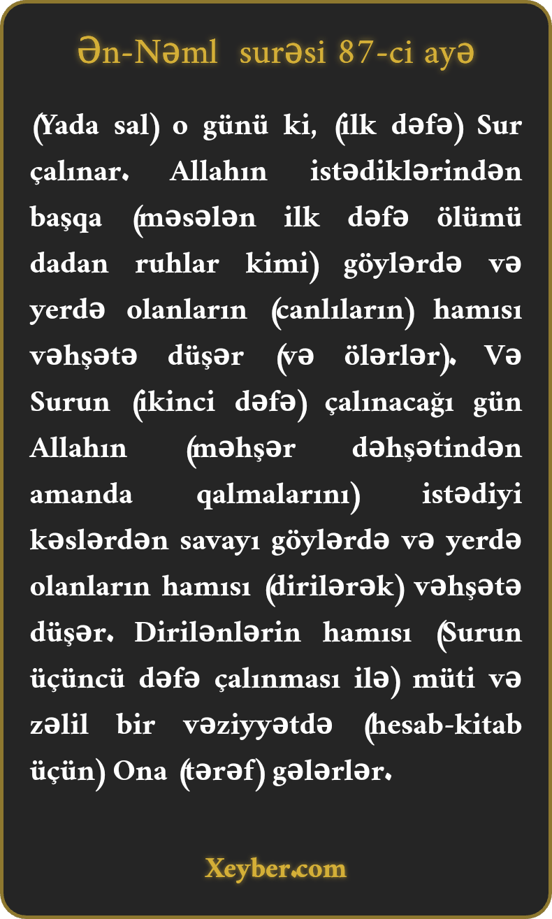 (Yada sal) o günü ki, (ilk dəfə) Sur çalınar. Allahın istədiklərindən başqa (məsələn ilk dəfə ölümü dadan ruhlar kimi) göylərdə və yerdə olanların (canlıların) hamısı vəhşətə düşər (və ölərlər). Və Surun (ikinci dəfə) çalınacağı gün Allahın (məhşər dəhşətindən amanda qalmalarını) istədiyi kəslərdən savayı göylərdə və yerdə olanların hamısı (dirilərək) vəhşətə düşər. Dirilənlərin hamısı (Surun üçüncü dəfə çalınması ilə) müti və zəlil bir vəziyyətdə (hesab-kitab üçün) Ona (tərəf) gələrlər.