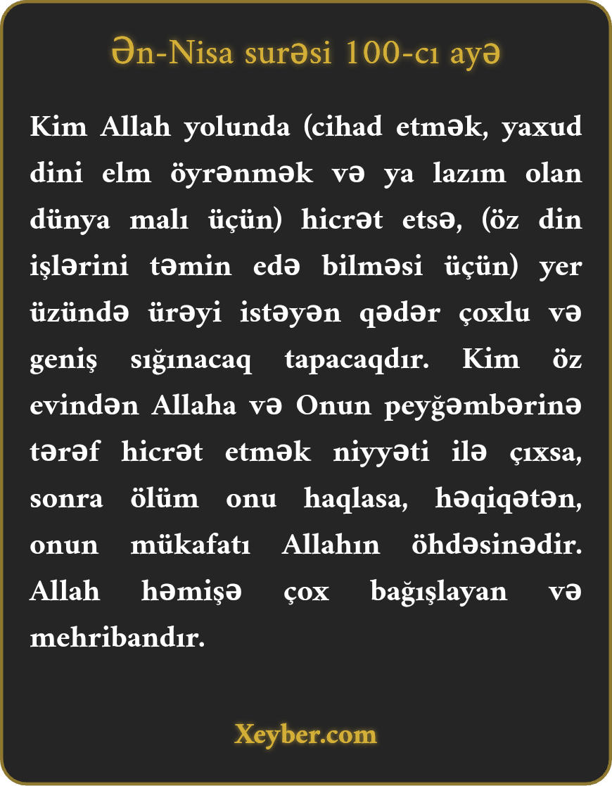 "Hər kəs Allah yolunda hicrət etsə, yer üzündə çoxlu və geniş sığınacaqlar tapar. Hər kəs hicrət edərək evindən çıxıb Allaha və Onun peyğəmbərinə üz tutsa, sonra onu ölüm yaxalasa, hökmən mükafatı Allahın öhdəsinədir. Allah bağışlayan və mehribandır.”