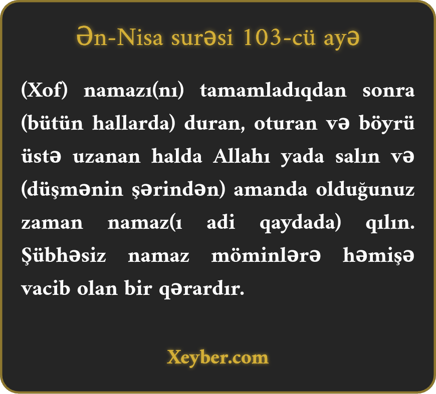 "Elə ki, namazı başa çatdırdınız, Allahı ayaq üstə, oturaq vəziyyətdə və uzanmış halda yad edin. Elə ki, aramlıq tapdınız (qorxu halı ötüşdü), namazı kamil şəkildə bərpa edin. Həqiqətən, namaz möminlər üçün müəyyən vaxtda vacib olmuşdur.”
